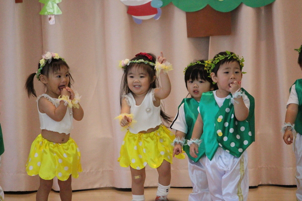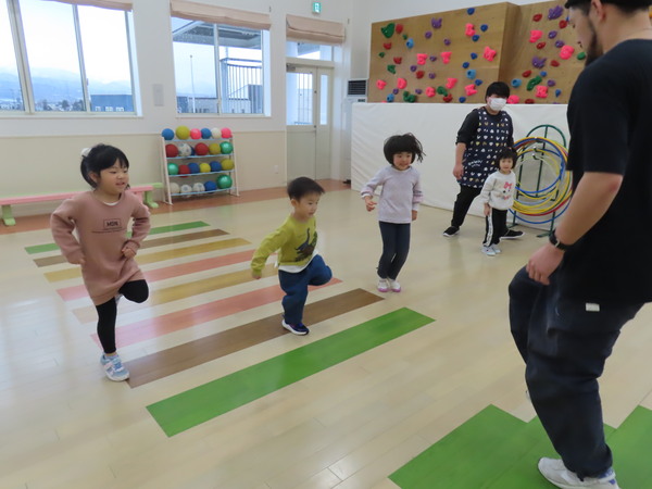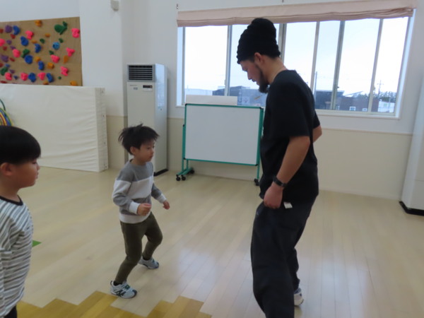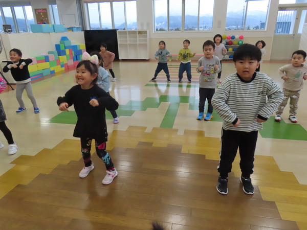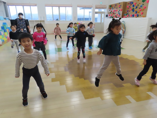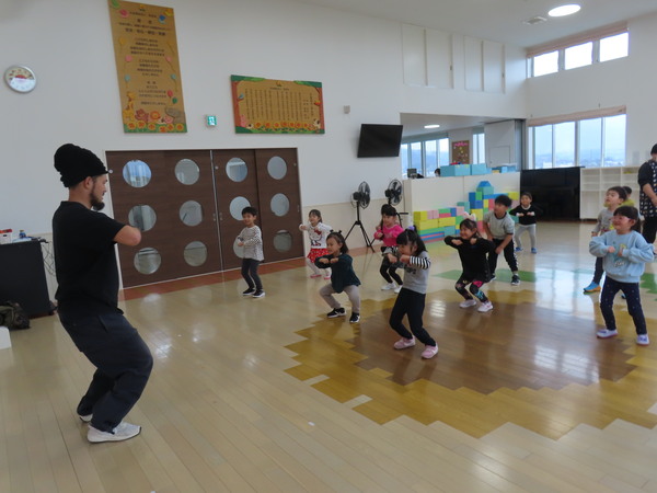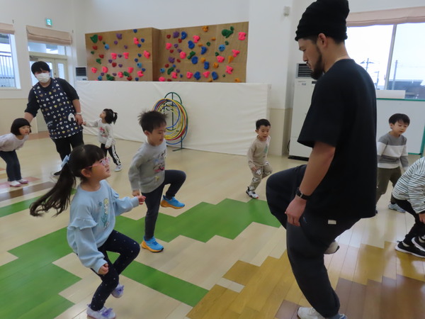 | うみ組(4歳児)さんが、今年度最後のダンス教室に参加しました。今回は前回より少し難しいリズム、ステップに挑戦しました。難しそうにしていたこどもたちでしたが、笑顔で楽しく活動していましたよ♪ | ||