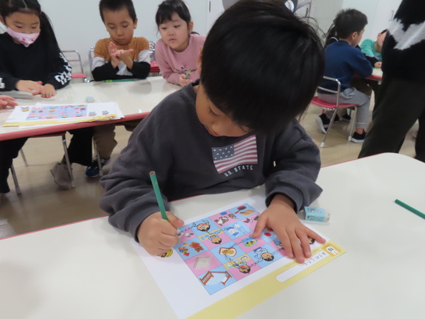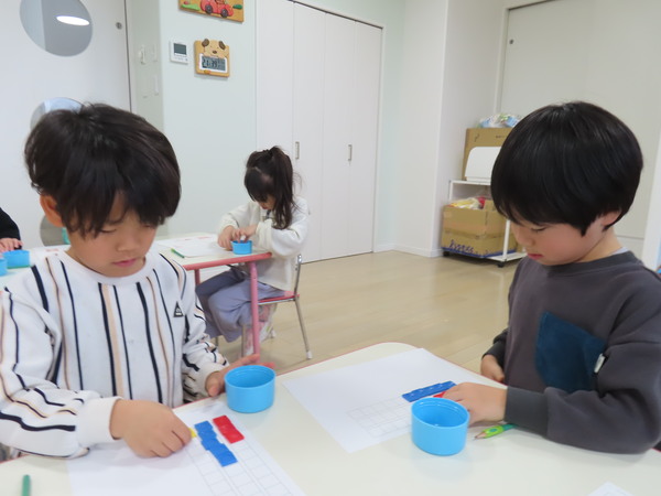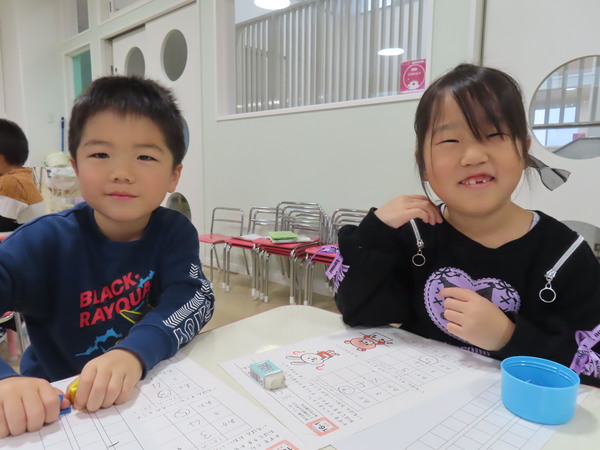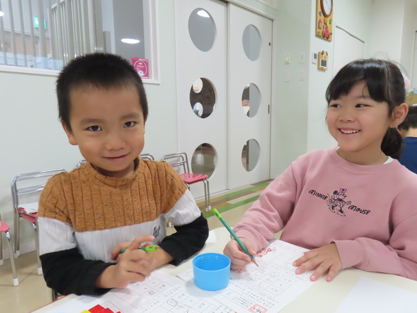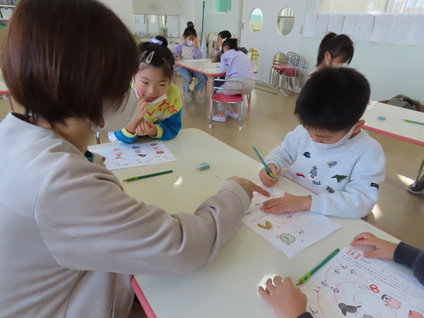 | やま組(5歳児)さんが、まなびタイムに参加しました。今回は数を比べるという問題をおはじきを使って取り組みました。そして、ワークシートに数を書き、一番多い色と少ない色に○をつけましたよ。次は、お話しを聞いて答える問題に挑戦しました。真剣な表情で取り組むこどもたちでした♪ | ||