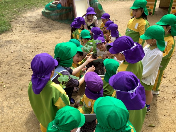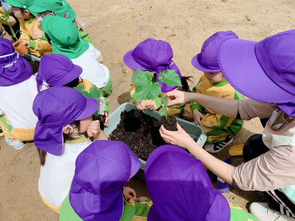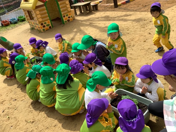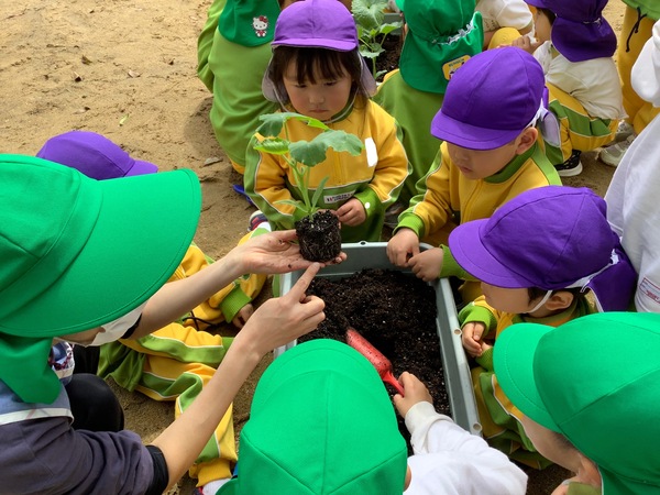 大きくなーれ! 園庭のプランターにきゅうりとかぼちゃとミニトマトの苗を植えました♪ポットから苗を出すと白いおひげが‥‥これはなーに?葉っぱに触れると‥‥よーく観察した後は土のお布団をかけて「おおきくなりますように!」 すご〜い! そーと やさしく これは何かなぁ? 大きくなーれ! 2026/04/23