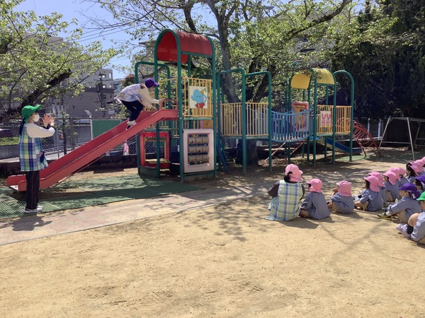 お外遊び これは〇かな✖️かな? 幼稚園のお庭には楽しい遊具がいっぱい!鉄棒にうんてい滑り台やぶらんこに砂場みんなで仲よくルールを守って安全に遊びましょうねあっ あぶない!!!こんな遊び方〇かな✖️かなぁ? 鉄棒で遊ぶときは‥‥ あっ あぶない! 雲梯はこんな風に遊ぼうね あっ あぶない あぶない 落ちちゃうよ! 反対からは✖️ですよー 2026/04/18