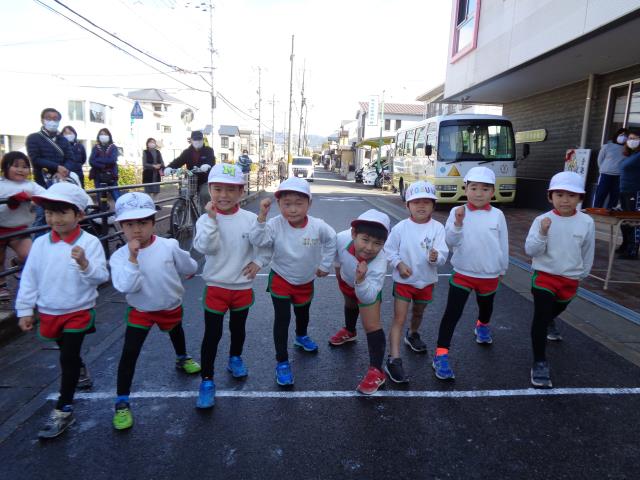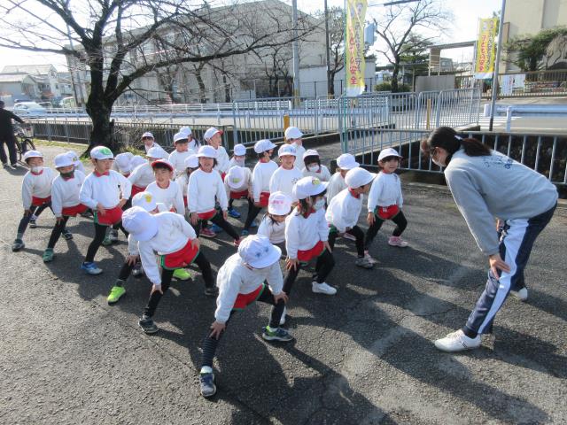 1月22日(金)本日年長組のマラソン大会が行われる予定でしたが、雨のため1月25日(月)に変更になりました。簡単にプログラムをお知らせ致します。11時よりウオーミングアップ、11:10分うめ組女子、11:20分さくら組女子、11:30分うめ組男子、11:40分さくら組男子が走ります。先導車は園長がバイクで走ります。後尾車は岡本先生が自転車でパトロールをします。各コーナーには役員様がパトロールをしていただきます。子ども達は一生懸命城南菱倉高校一周約1キロメートルを走ります。走った後はゆっくり歩いて整理体操をしましょう。優勝者には表彰状を与えます。例年、終了後みんなで炊き出しを美味しくいただくのですが、コロナウイルスのために残念ですがストップします。皆さん、頑張って下さい。