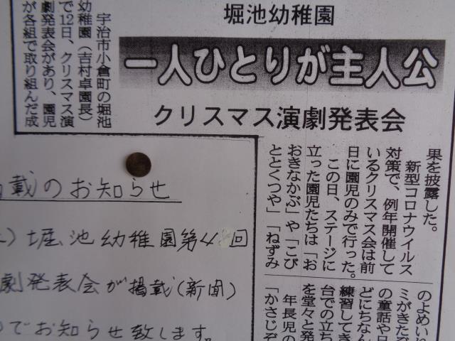 12月12日(土)行われた堀池幼稚園第47回クリスマス演劇発表会が13日(日)朝刊に掲載されましたのでお知らせ致します。当日は子ども達の見事な演技に感動していただけたと思います。又、コロナウイルス予防にご協力いただき、沢山の拍手ありがとうございました。 |