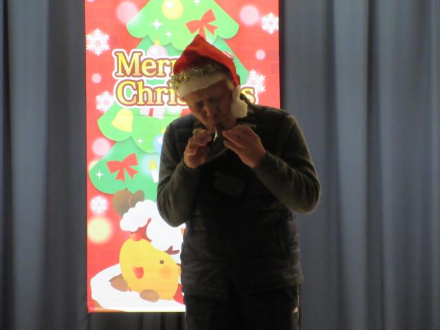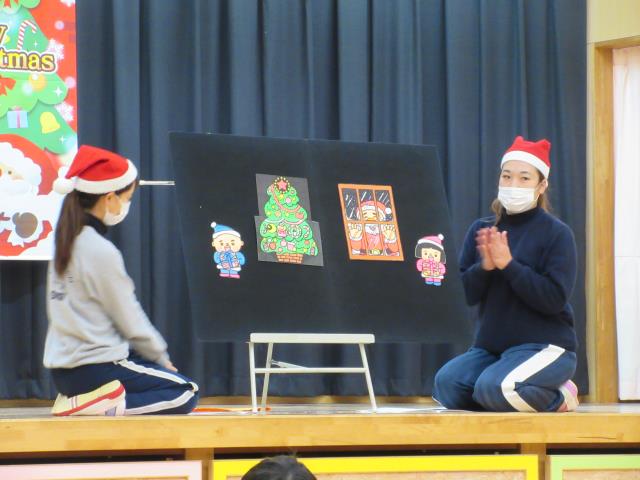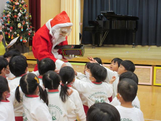 12月9日(水)午後から12月生まれお誕生会が行われました。先生からのプレゼントを受け、みんなでハッピーバースデーの歌を歌って祝いました。チャーリーのチョコマジがありました。その前にクリスマスソング「聖夜」をオカリナ演奏とピアノのコラボレーションでありました。電気を消し、聖しこの夜を吹くと素晴らしいとおっしゃっていただきました。そのあとトナカイとサンタクロースの予言のマジックがあり、先生方のパネルシアター「北風と太陽」のパネルシアターがありました。森先生のエプロンシアターも楽しかった。1月はマジックショーとケンちゃんショーもありますから楽しみに待って下さい。 |