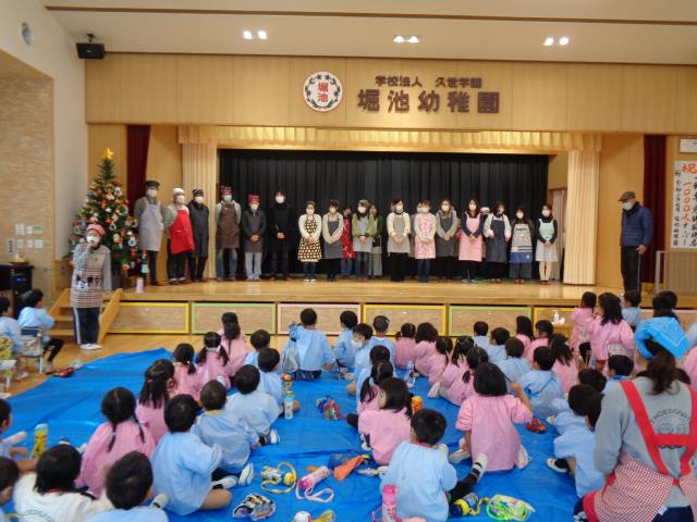 12月12日各家庭1名参観のクリスマス演劇発表会が行われました。9時30分開場ですが、7時から待っていただいた方もおられました。もちろん1メートルおきに並んで待っていただき、検温、消毒、マスク着用して入場していただきました。園長のオカリナ演奏「きよしこの夜」ではじまりました。各クラスごとに演劇が始まりました。舞台に立つのは初めてで、又、保護者がおられるのは初めてでしたが、力いっぱい日ごろの成長を見せていただきました。素晴らしかったと思います。子供たちの素晴らしい演技にご家庭でもほめてあげて下さい。 |