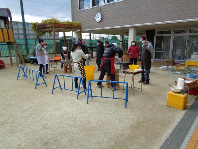 12月15日(火)恒例のお餅つき大会が行われました。コロナウイルスのためにお餅つきは園庭で、楽しいイベントや食事は体育室でしました。年長組のお友達はなんと「25ケ食べたよ」と大きな声で言っていました。お餅は子ども達みんな大好きです。お土産までいただきました。保護者会役員の皆様ありがとうございました。 |