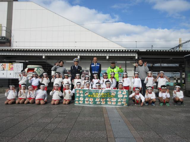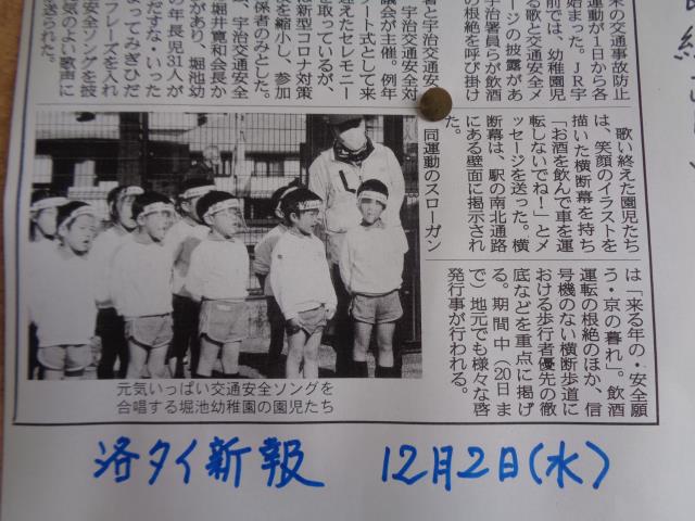 12月1日(火)11時より、JR宇治駅南ロータリーで「年末の交通事故防止府民運動が、宇治警察署、宇治市交通安全対策協議会、宇治交通安全協会、堀池幼稚園主催で開催されます。子供たちが「お酒を飲んで車を運転しないでね!」など大きな声で、呼びかけます。お歌も2曲「堀池幼稚園園歌、交通安全の歌」を歌います。もちろん、フェイスマスクはしています。横断幕には堀池幼稚園年長組の絵も展示しています。どうぞご覧ください。 警察の研修では防犯標語として、よく「いかのおすし」を学びます。「いかない」「のらない」「大きな声を出す」「すぐ逃げる」「知らせる」ということです。皆さん、覚えておいてください。 堀池幼稚園の玄関に飾られていたクリスマスツリーは久御山町のイオンモールに飾られています。買い物などに行かれた時は是非、ご覧ください。 |