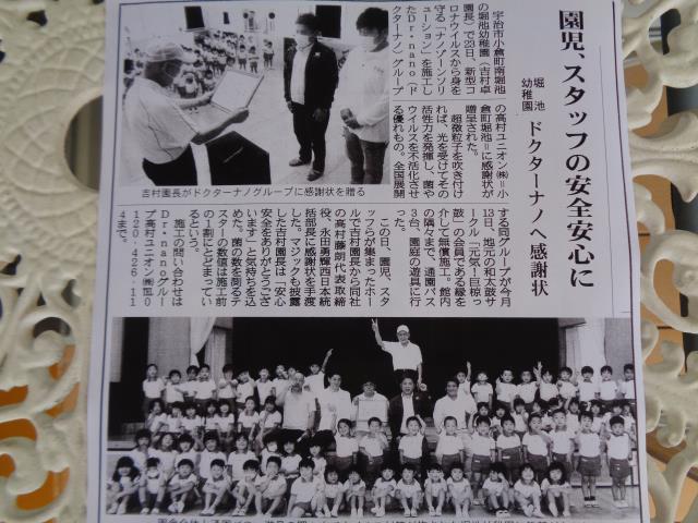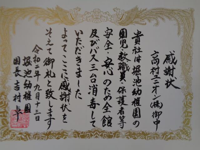 9月24日(金)コロナウイルスから身を守るために全館消毒とバス3台消毒していただいた高村ユニオン株式会社高村社長に感謝状を贈呈させていただきました。新聞に大きく報道されましたので、ご披露致します。 |