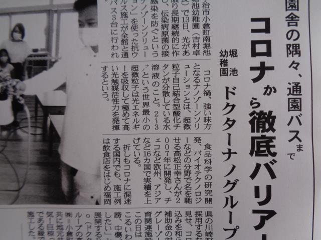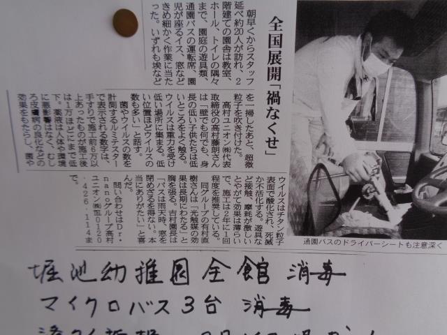 先日堀池幼稚園全館消毒とバス3台消毒していただきました。9月16日本日の新聞に大きく掲載されていましたのでお知らせ致します。 |