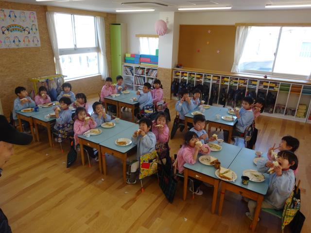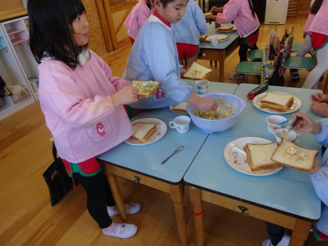 2月21日(金)年長組はサンドイッチつくりに挑戦しました。卵もきゅーりも、ハム、マヨネーズなどおいしそうに出来上がりました。パンは3枚でボリューム満点でしたが、みんなで一緒においしく、楽しくいただきました。 |