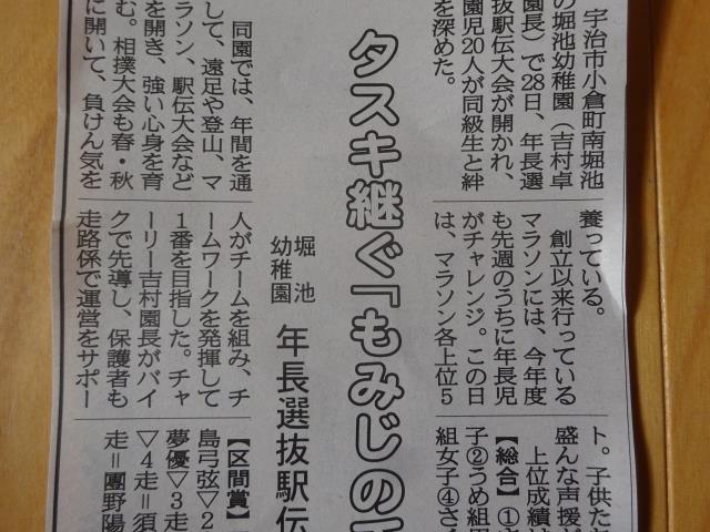 1月28日年長選抜駅伝大会が行われました。天気が心配で、30分スタートを早めましたが、最後まで雨が降らずに全員見事に走り切りました。新聞に掲載されましたのでご報告いたします。 |