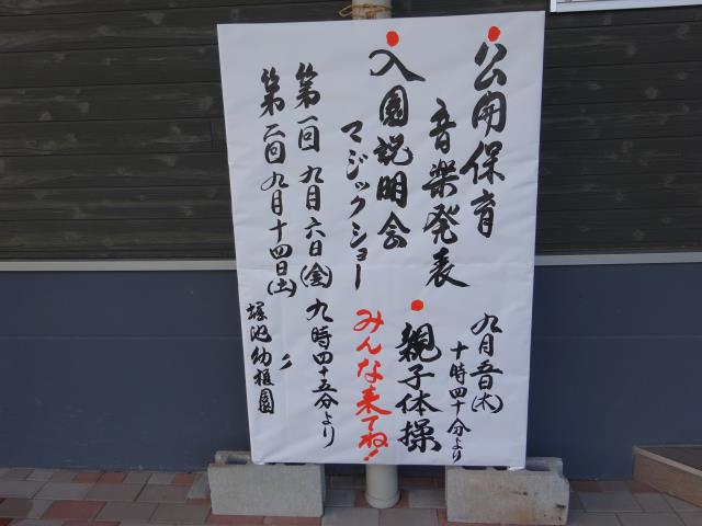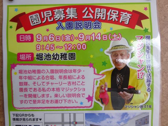 明日、9月14日土曜日に第2回公開保育を行います。本園の特徴、体育ローテーション、日課活動や音楽発表も見て頂けます。楽しいチャーリー吉村のマジックショーもあります。 保育を見て頂いた後には入園説明会もあります。 保育スタートは9時45分です。 皆様のお越しをお待ちしております。 |
