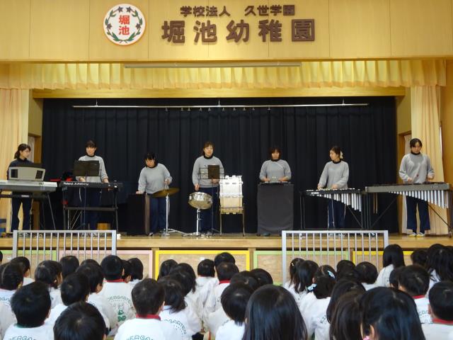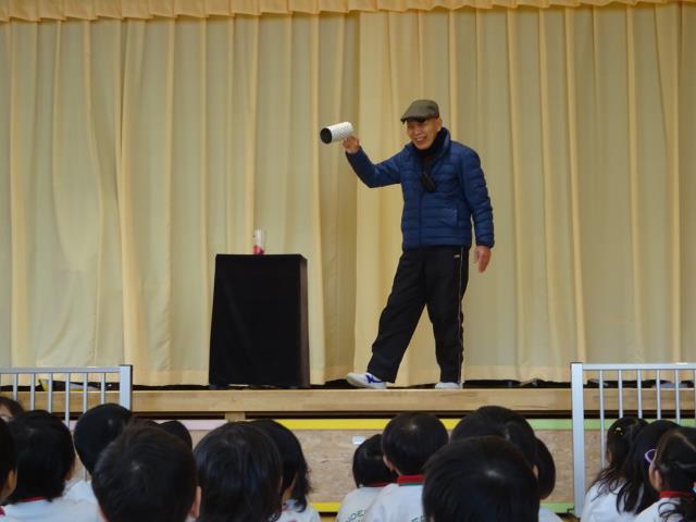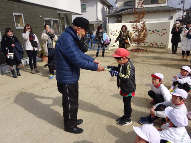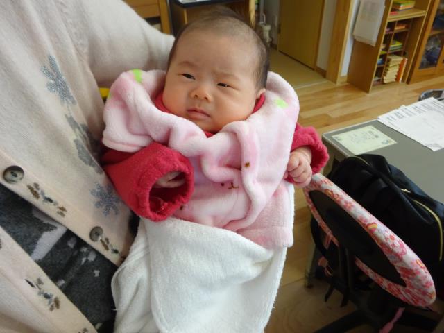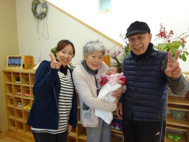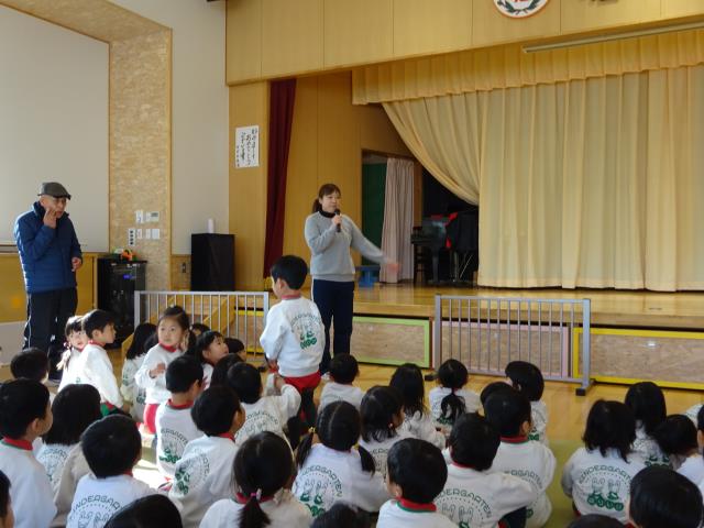 1月16日石井先生(旧吉村)が赤ちゃんを連れて金沢から挨拶に来てくれました。年長の子供たちは沢山知っていますので、大変喜んでいました。年中の合奏や年中の合奏も聞いてくれました。さすがにまとまっているねと褒めていただきました。昼ごはんをいただき、ラジオ体操の後、皆にエ-ルを送っていただきました。先生もお元気で立派に子育てをして下さい。 |
