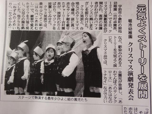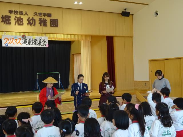 12月4日クリスマス演劇発表会の予行演習がありました。本来なれば11月30日だったのですが、急遽、警察からの連絡で、年末、年始の交通事故防止スタート式に出動致しました。それ故、少し遅いですが、本日になりました。本番は12月8日の土曜日です。さすがに本園の子ども達で役者になりきり、力一杯、元気一杯素晴らしい演技を見せて頂きました。午後からはクリスマスソングを3曲歌いました。サンタクロースを迎える準備も完全でした。当日は保育参観で沢山の保護者が来ていただけると思います。子ども達の豊かな成長に大きなエールを送って下さい。 |