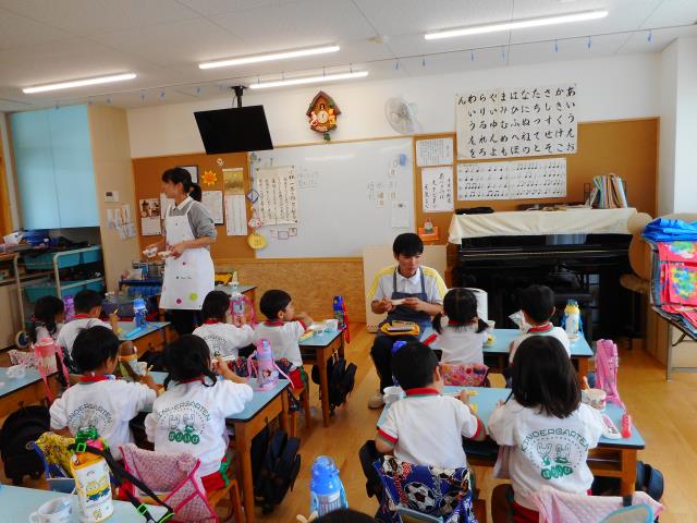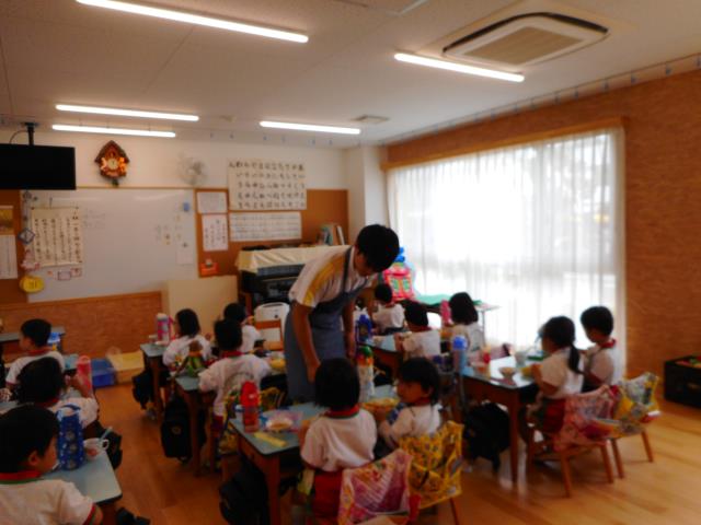 | 来園された大学教授 | 園児と一緒に給食を食べる | 給食の用意 |