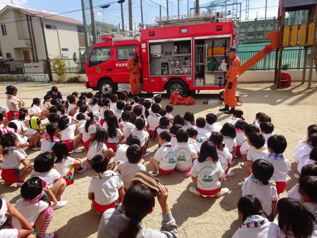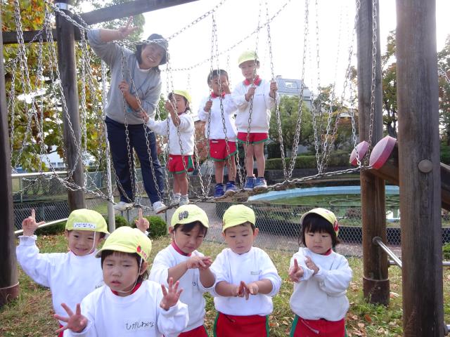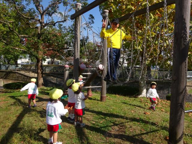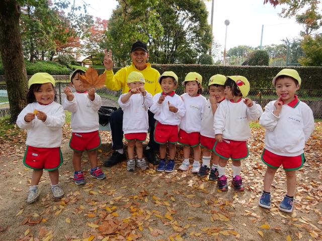 11月6日ひよこ組(最年少)と一緒に園外保育に行きました。前日から当日の朝にかけ雨が降り、心配しましたが、その後、絶好の秋日和に恵まれました。場所は久御山町の中央公園です。遊具も沢山あり、紅葉も美しく楽しく遊べました。お弁当も一緒に食べました。お友達もみんな楽しかったと言っていました。又、楽しく園外保育に行きましょう。 |