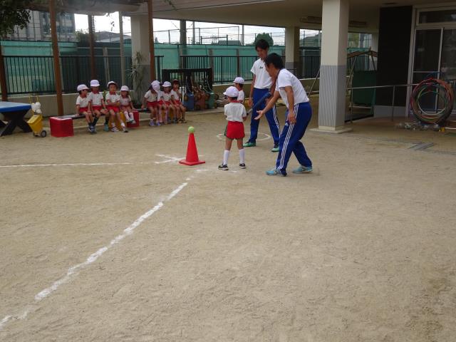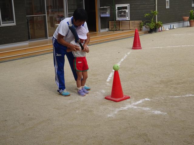 11月1日ジャクパスポーツクラブから二人の先生が着て、子ども達にテイーボール(野球、ソフトボールの基本)を教えていただきました。止まったボールを打って、1塁、2塁、3塁と走ります。1塁まで行けば、1点です。トータルで勝負を競います。子ども達は大喜びでした。 |