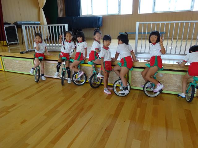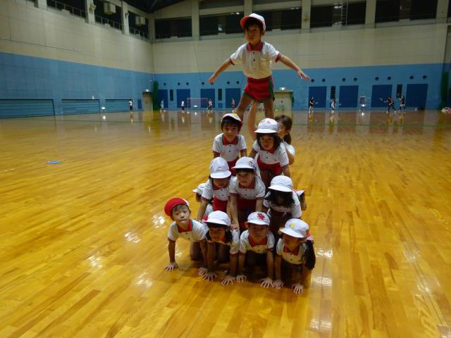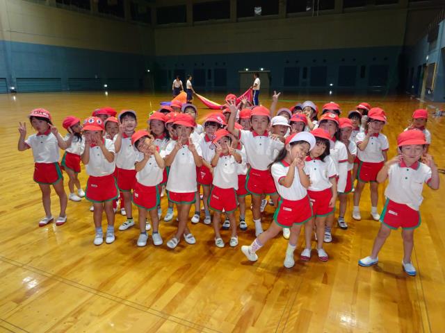 10月6日(土)行われる大運動会の入退場の練習が始まりました。連日雨でしたが、連休を明けると絶好の秋晴れになりました。2歳児、3歳児、4歳児、5歳児揃って入場式の練習です。手を振って足を上げて、歩行の練習です。はじめの言葉は年長さんが言ってくれましたが、さすがに本園の年長、実にしっかり、はっきり言えていました。オープニングの体操はラジオ体操第1です。毎日、昼休みしていますので、大変j上手です。エンディングの体操は「1等賞体操」です。これも力強くしっかりしていました。最後は保護者と一緒に踊るフォークダンスです。実に楽しそうでした。最後の終わりの言葉は年中組さん2人がしてくれました。暑い中、しっかり練習が出来ました。後はしっかり水分補給と休憩をとって下さい。 |