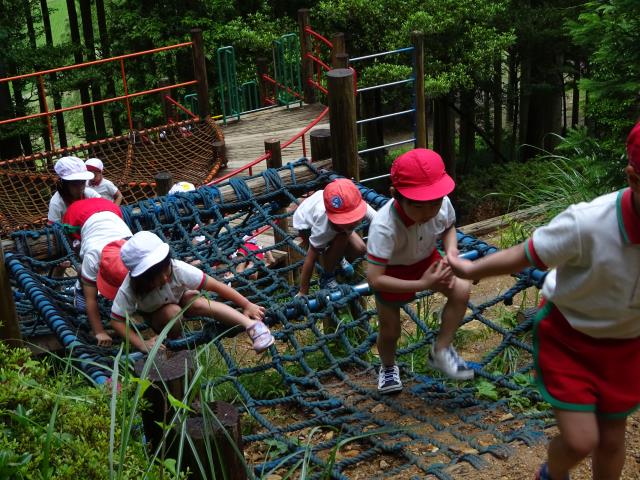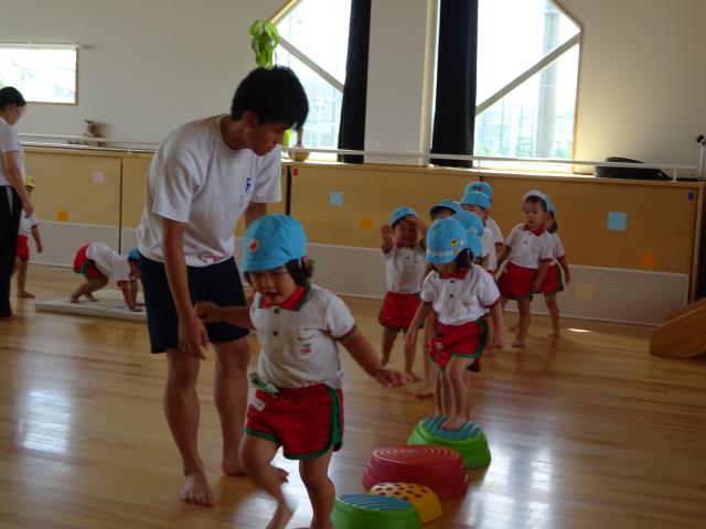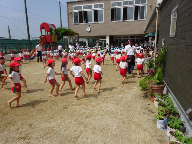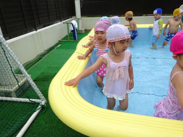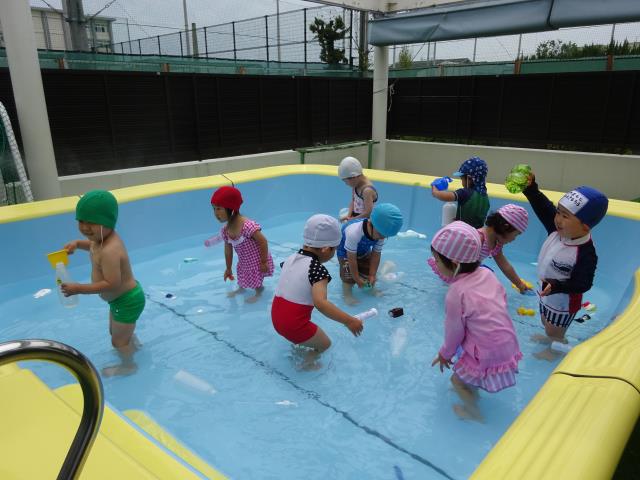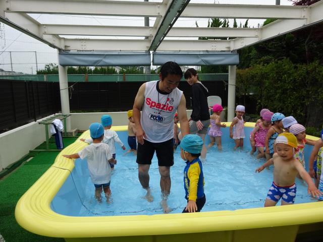 6月21日全園児が楽しみにしているプール遊びが始まりました。年少組、年中組、年長組各クラス30分ほど水遊びを楽しみました。講師はジャクパ体操教室の三原先生です。8月末まで続きます。水の事故に注意して、存分に楽しんで下さい。 |