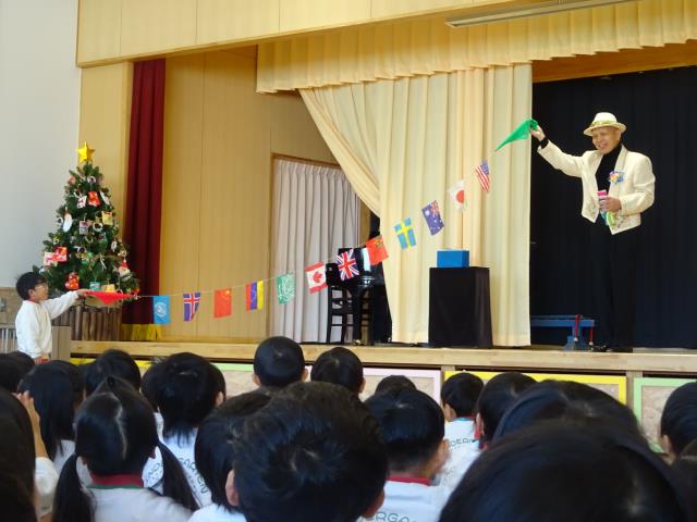 12月9日クリスマス演劇発表会が開かれ、可愛い衣装に身を包んだ園児たちが、保護者の前で、役者になりきり、見事な演技を披露してくれました。オープニングは場内を暗くして、聖夜の曲を流し、その中を園長が大きなローソクを持って壇上に立ちます。そのローソクにハンカチをかぶせると、一瞬にしてクリスマスツリーに変わります。ツリーから青や赤のライトが光り、幻想的な光景でした。その後体育室の明かりがともり、園長のあいさつが始まりました。「最後までしっかり頑張って、成長した姿を保護者に見ていただきましょう」ひよこ組から始まり、最後はさくら組さんまで、劇あり、ミュージカルあり、日本昔話あり、成長したわが子を見て保護者も感動されていました。その後、クリスマス会が始まり、メリークリスマスや赤鼻のトナカイ、あわてんぼうのサンタクロースを全員で合唱しました。その後、サンタクロースが来てくれて、マジックでお菓子を沢山だして園児に配っていただきました。翌日の新聞にも大きく掲載していただきました。 |